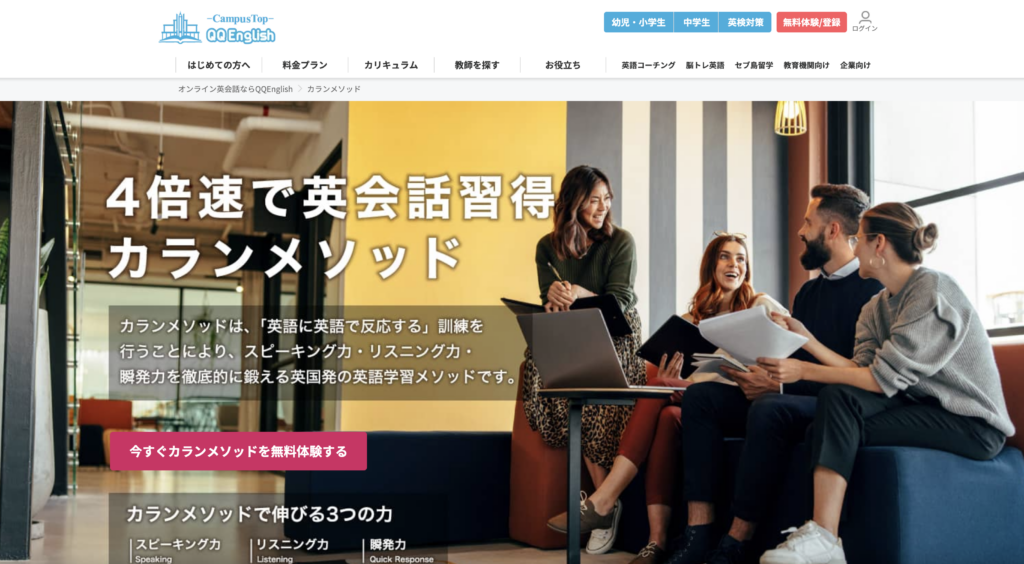 QQ Englishは、フィリピン人講師による質の高いレッスンが特徴のオンライン英会話です。講師は全員正社員として採用・研修されており、指導の安定感があります。英検専用コースも用意されており、面接対策にも対応しています。